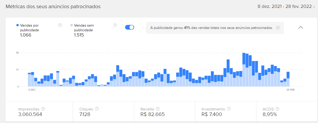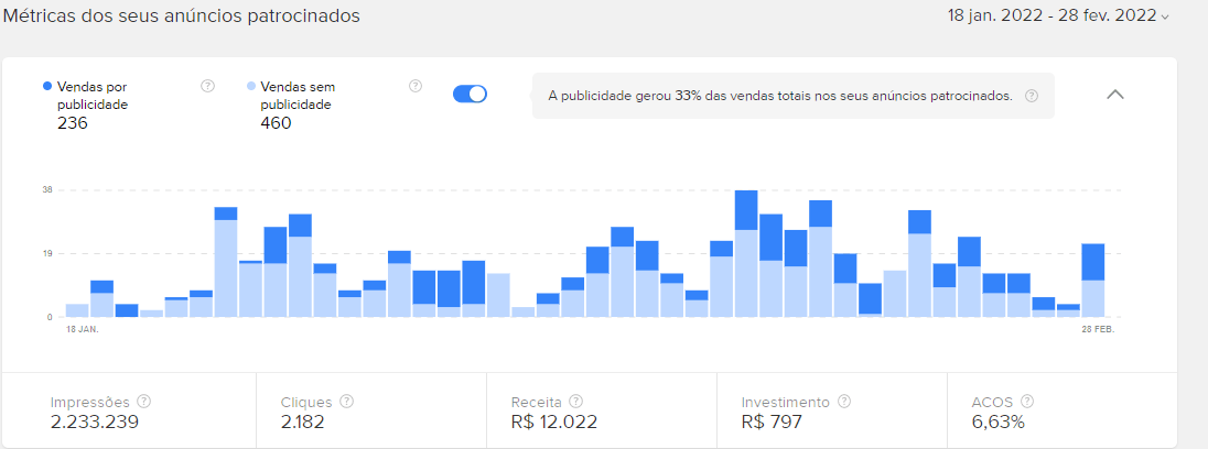 No administrador de campanha você verá informações detalhadas sobre quantas vezes seus anúncios patrocinados foram mostrados, o número de cliques recebidos, as vendas concretizadas pela publicidade e o investimento acumulado.